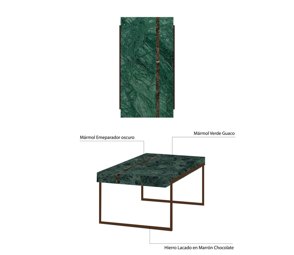 Mármol Verde Guaco + línea en Mármol Emperador oscuro y hierro lacado en marrón chocolate RAL 8017.