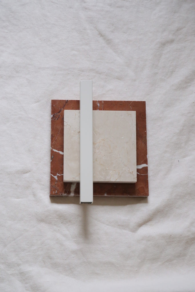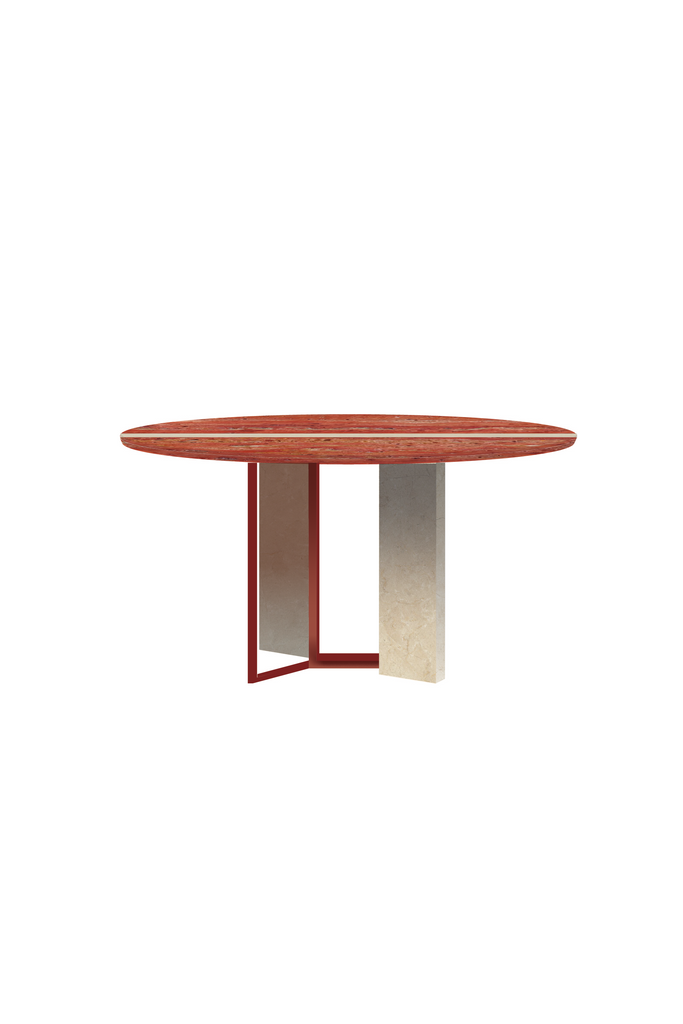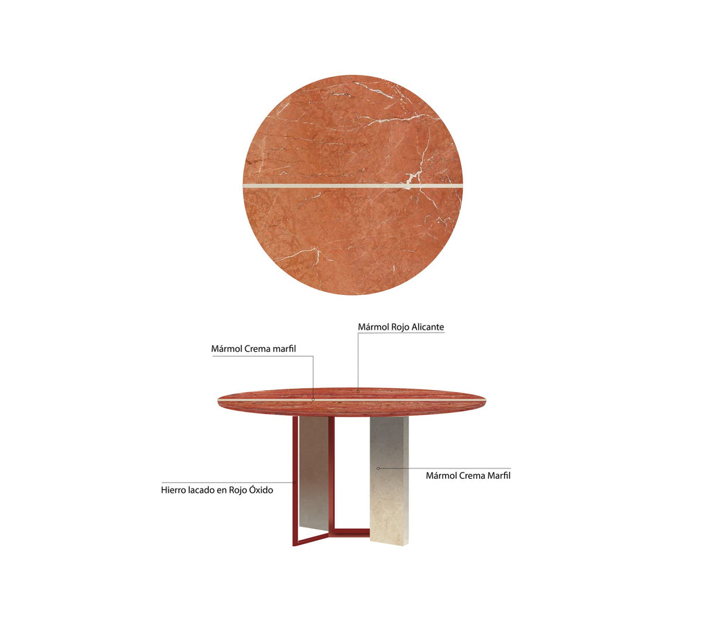 Tapa en Mármol rojo Alicante + línea y patas en Mármol crema marfil y hierro lacado en RAL 3009.