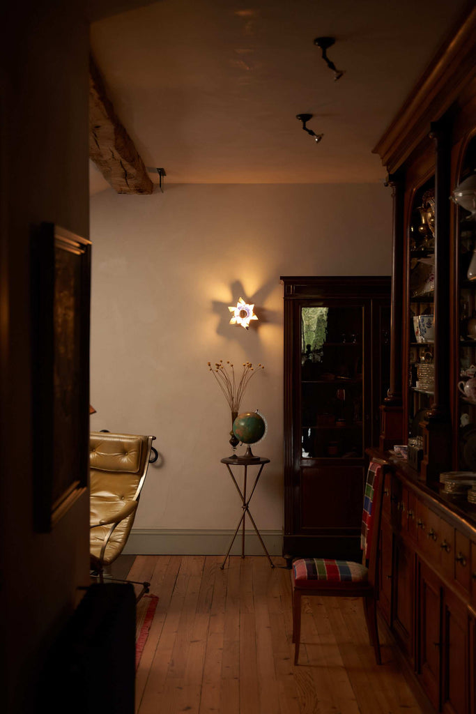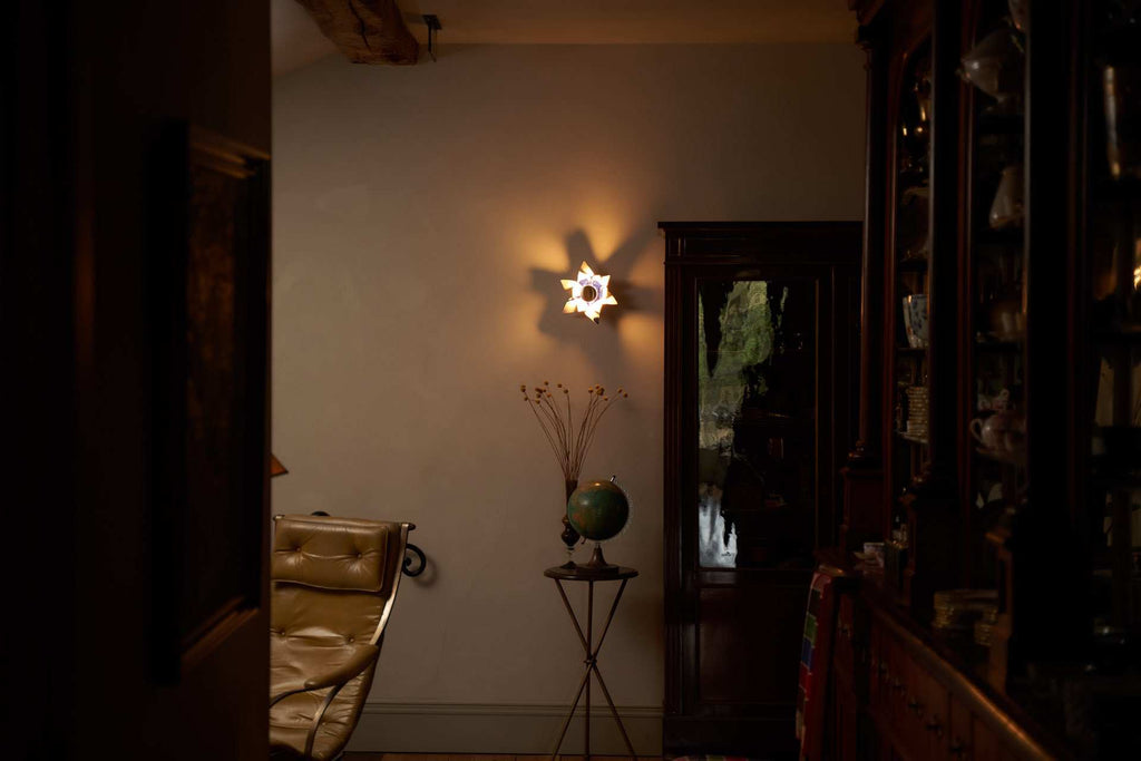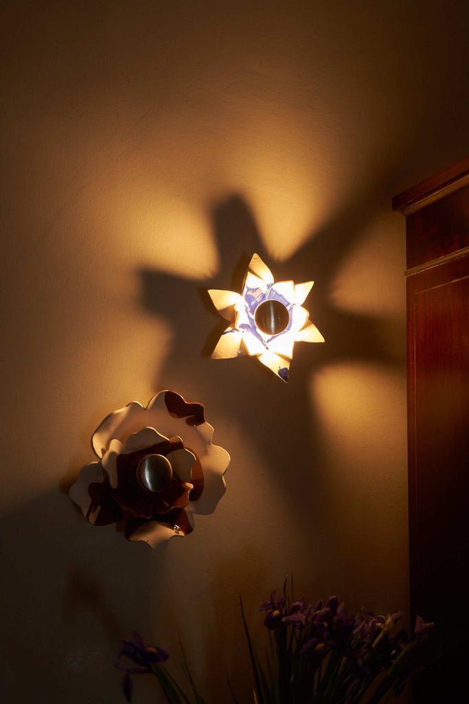 La iluminación de esta colección invita a la contemplación a través de la luz. Gracias a su bombilla espejada pone en valor la pieza quedando toda ella iluminada y permitiendo discernir las diferentes texturas que la componen. Mediante una tecnología puntera su bombilla de acabado acero permite regular por pulso su intensidad en tres pasos sin necesidad de regulación en la pared.