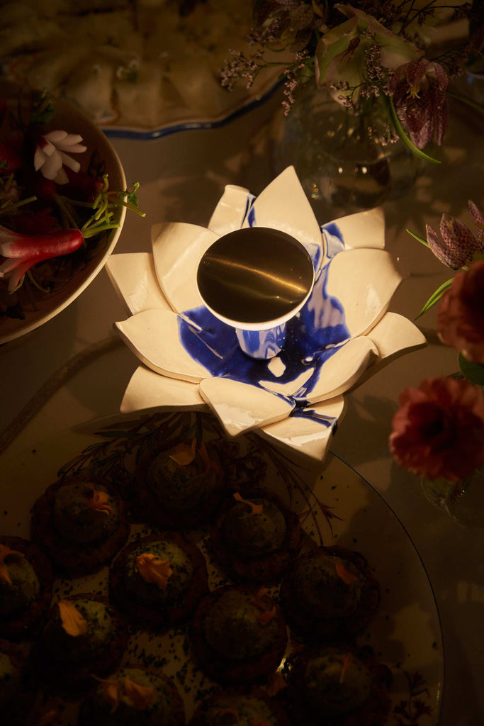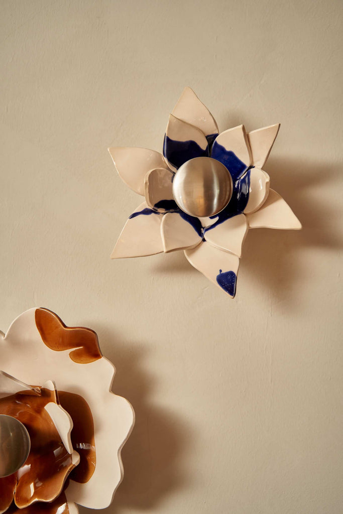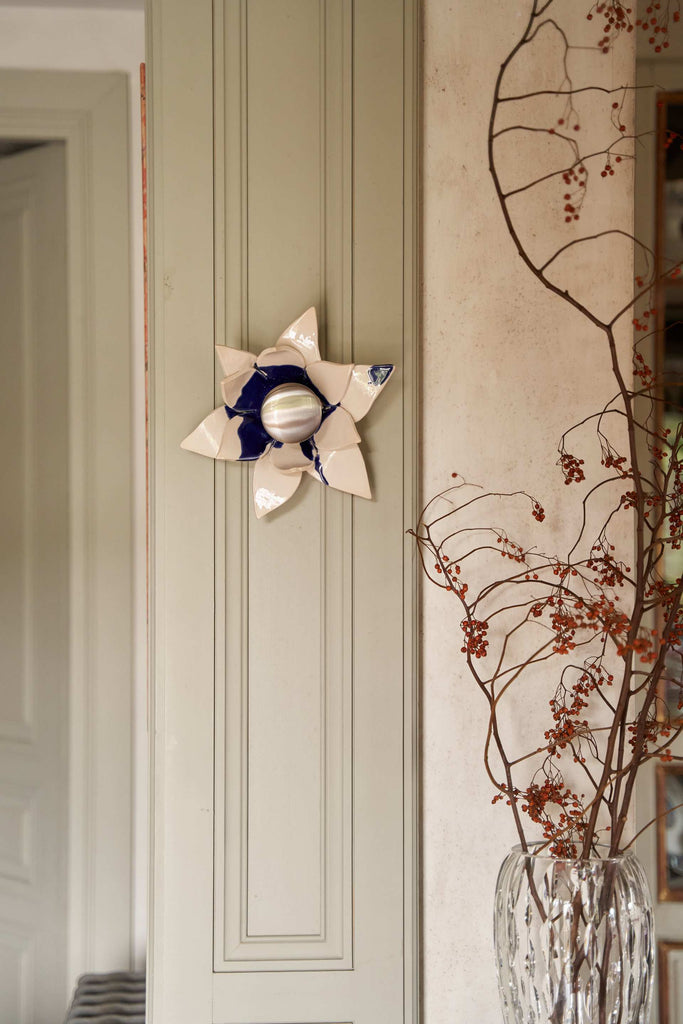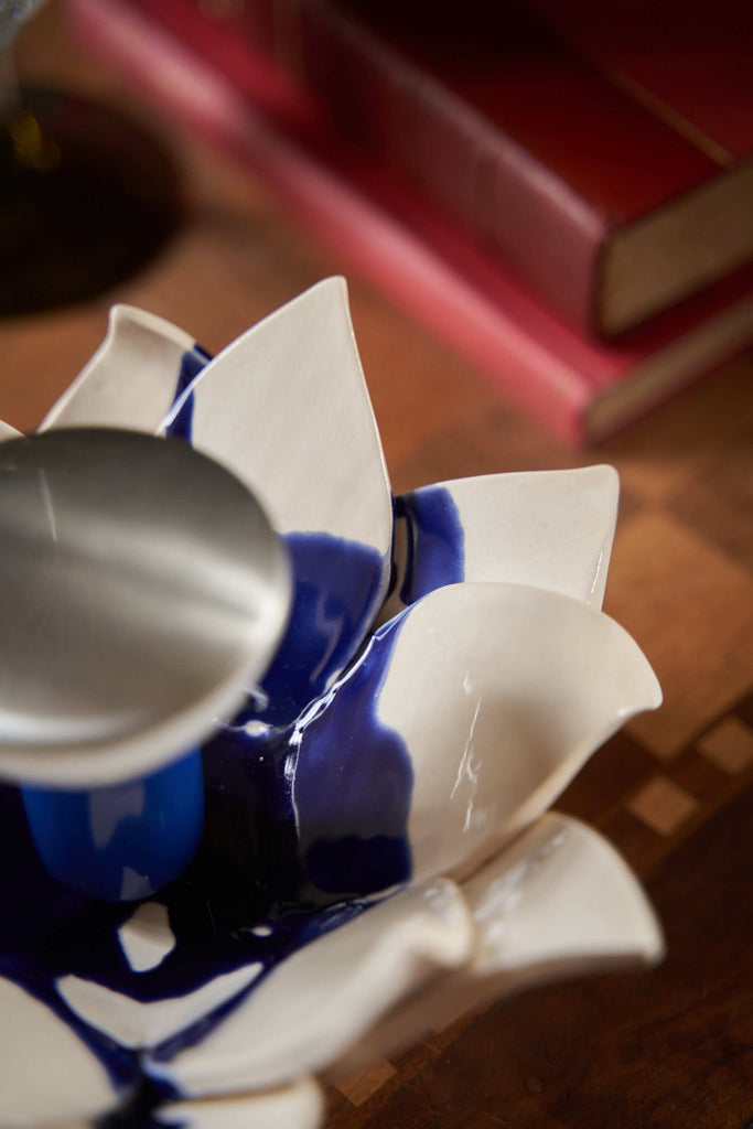 La Clematis maculata está manchada de un esmalte azul cobalto intenso. Esta delicada pieza de cerámica blanca nos hace soñar con los días y las noches del verano Mediterráneo.