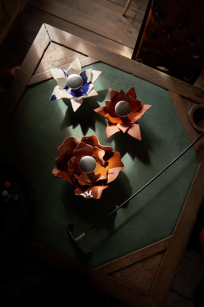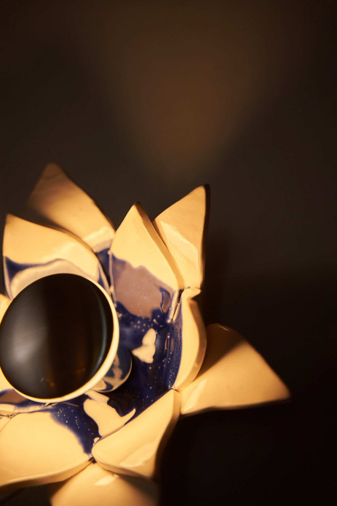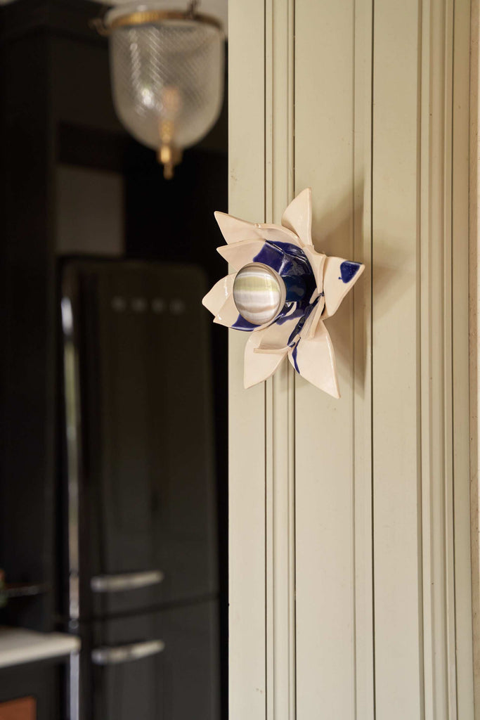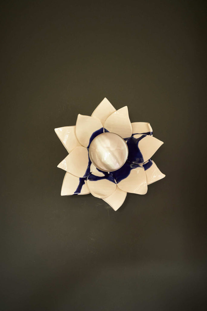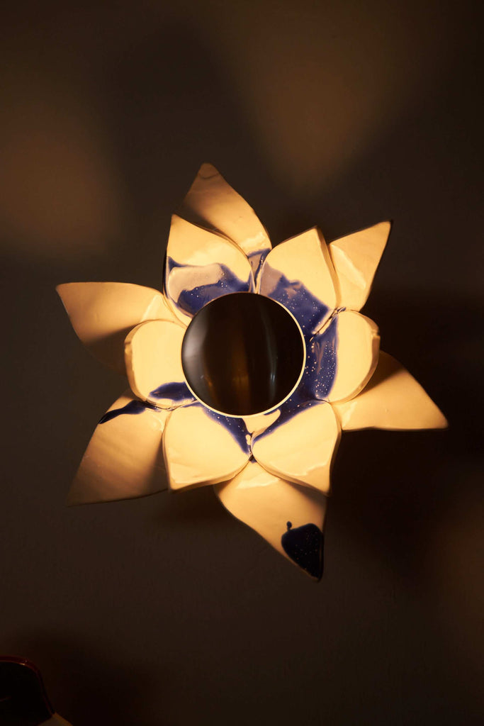 La Clematis maculata está manchada de un esmalte azul cobalto intenso. Esta delicada pieza de cerámica blanca nos hace soñar con los días y las noches del verano Mediterráneo.