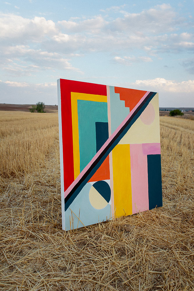 Colección “Prisma”. Arista: Lourdes Sendagorta. La obra se caracterizada por su frescura. Plasma la esencia del color y de las formas geométricas y la intersección entre ellas. Colores vivos que se funden entre pasteles hacen de esta composición una gama cromática muy especial y con carácter. Una obra realizada con la técnica del acrílico.