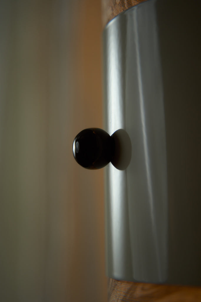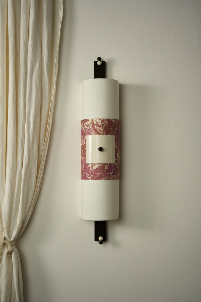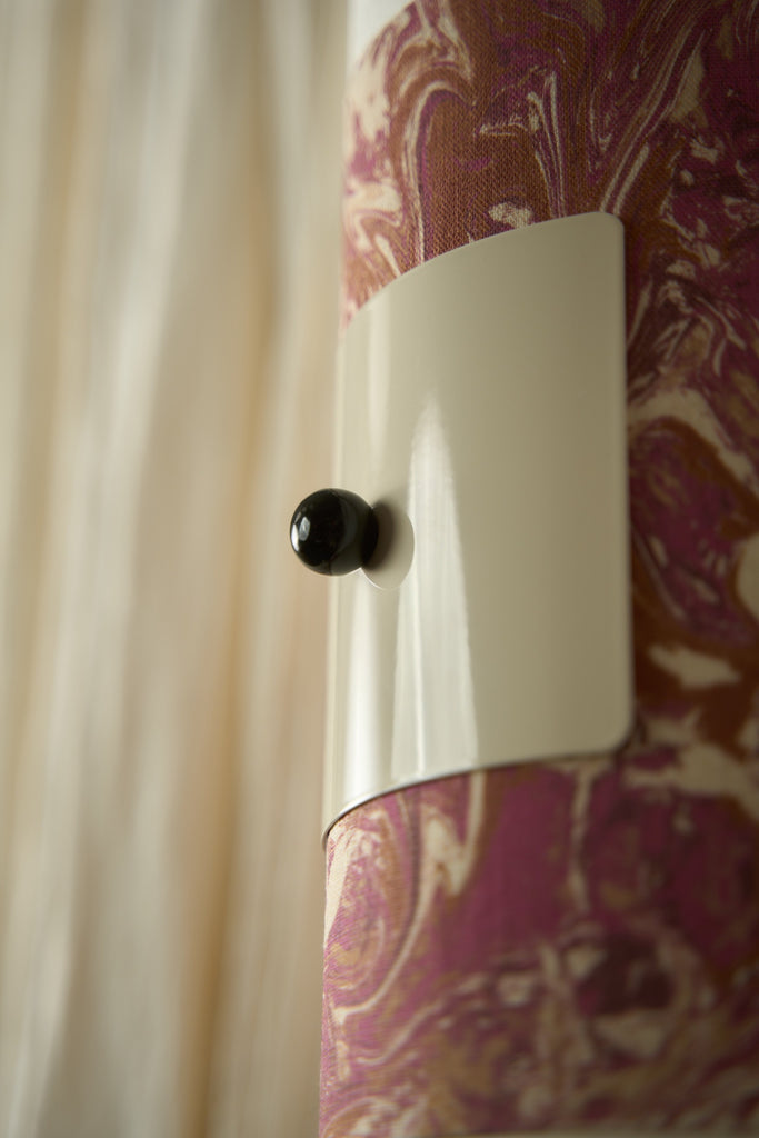 Aplique de pared escultural. La laca brillo del metal contrasta con el lino de la pantalla y combina con el diseño marmoleado de la pieza central. La luz se difumina a través de la tela consiguiendo una iluminación única.