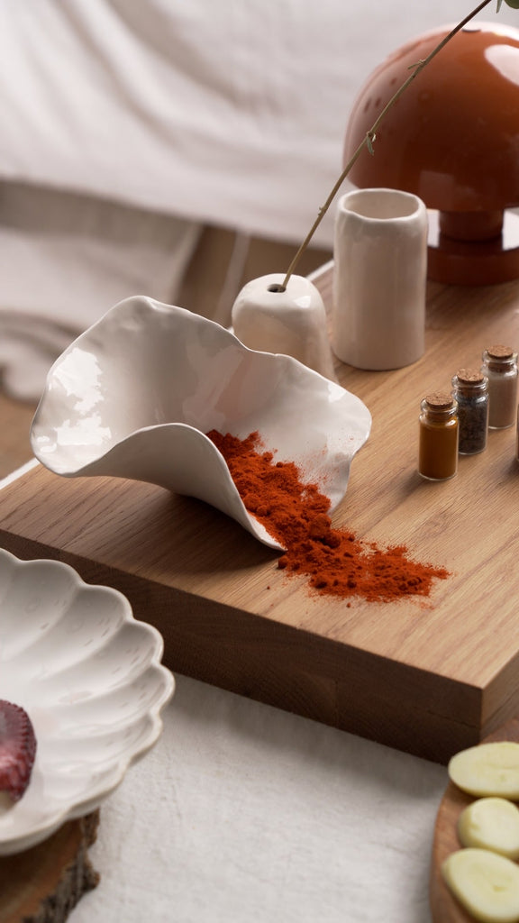 Una lámpara simpática donde las haya. Baña de color la superficie dónde se encuentra de forma muy agradable y sin deslumbrar. Un objeto-lámpara que alegra cualquier espacio. Lámpara de mesa inspirada en los sabores y colores vibrantes de las especias de la India. ¿A qué saben los colores? A Pimentón, cacao, sésamo y sal, remolacha, cúrcuma y azúcar de caña.