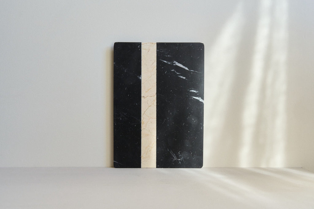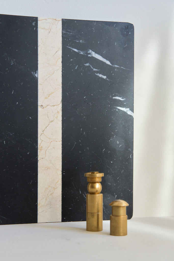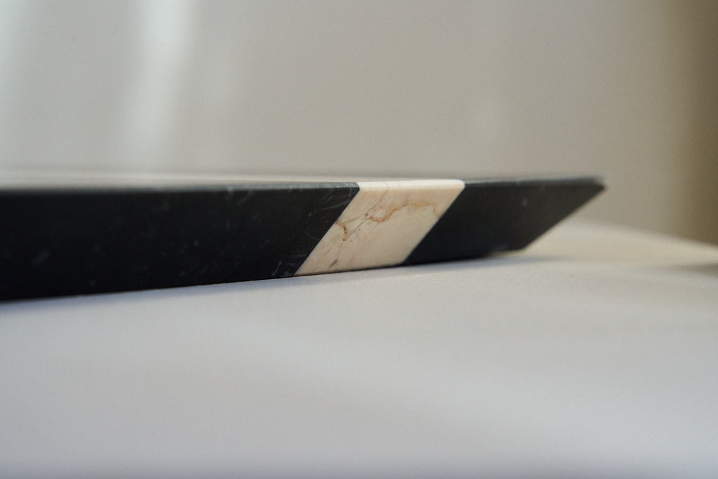 Black Marquina Marble + line in Ivory Cream Marble and black grey lacquered iron RAL 7021.