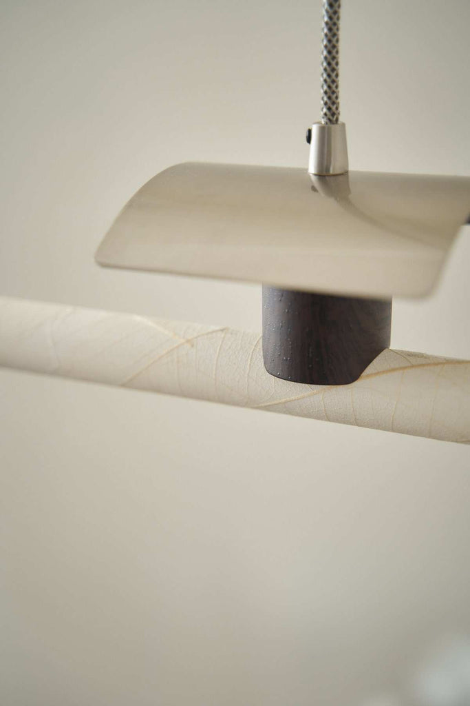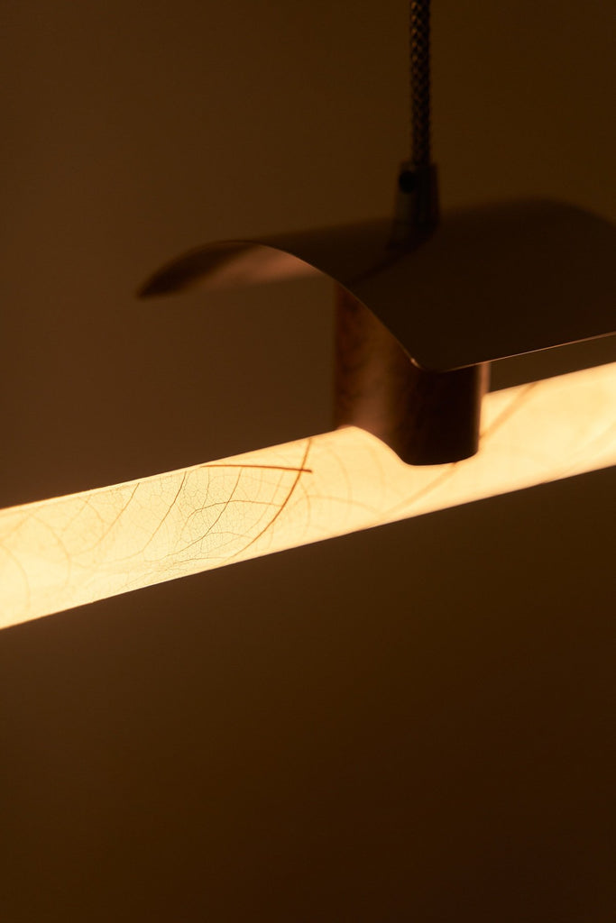 For this wall light we have created the most special light bulb. Skeleton cover of real dry leaves from the rubber tree; It allows light to pass through and regulate, creating a unique atmosphere. Decorative details in a steel finish that frame the beautiful shapes of the paper.