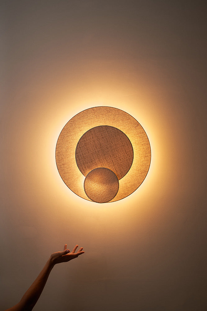 Nous utilisons la combinaison de lin, de papier texturé et de tissu bouclé avec du laiton. Le laiton est un matériau qui vieillit avec le temps. Pour l'embellir, il est recommandé d'utiliser un nettoyant pour métaux.
