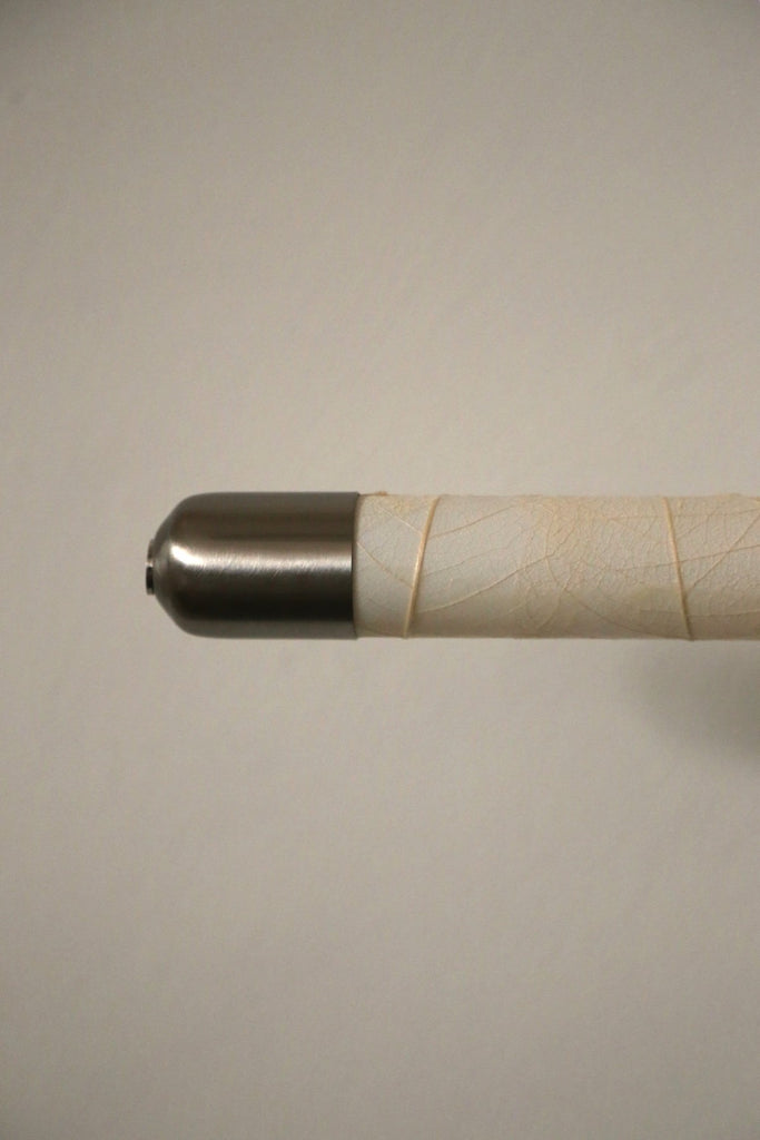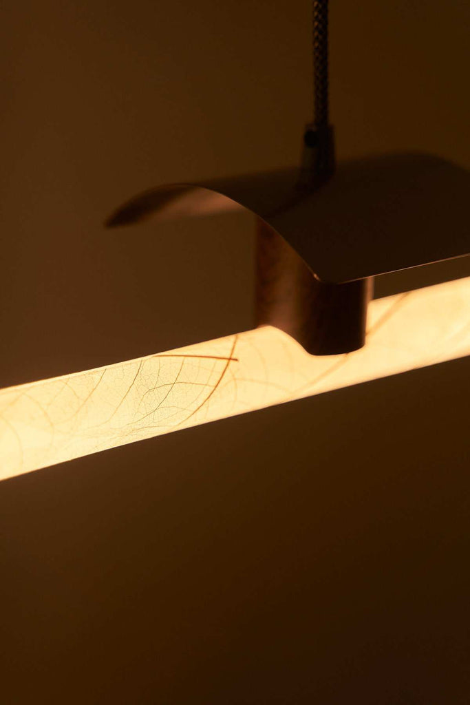 Pour cette applique murale, nous avons créé l'ampoule la plus spéciale. Couverture squelettique de véritables feuilles sèches de l'hévéa ; Il laisse passer la lumière et la régule, créant une atmosphère unique. Détails décoratifs en finition acier qui encadrent les belles formes du papier.