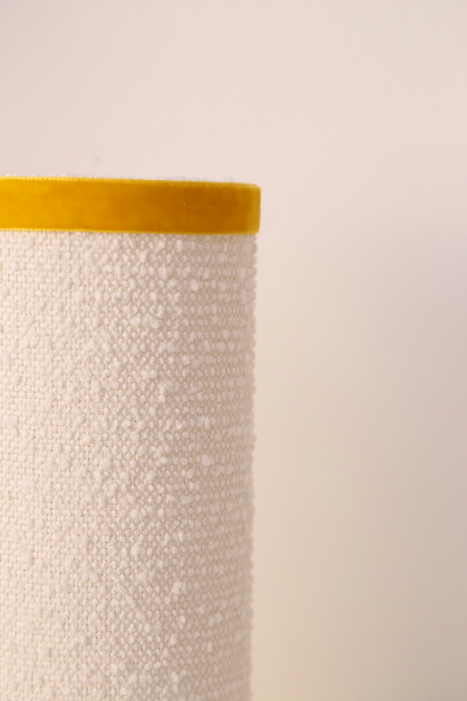 Aplique tubo con vivo en terciopelo y aparataje de latón. Nos gusta por su luz cálida y nos gusta como apliques para mesillas de noche.