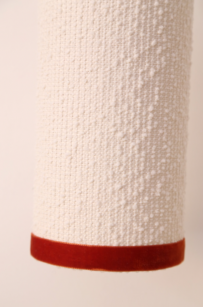 Aplique tubo con vivo en terciopelo y aparataje de latón. Nos gusta por su luz cálida y nos gusta como apliques para mesillas de noche.