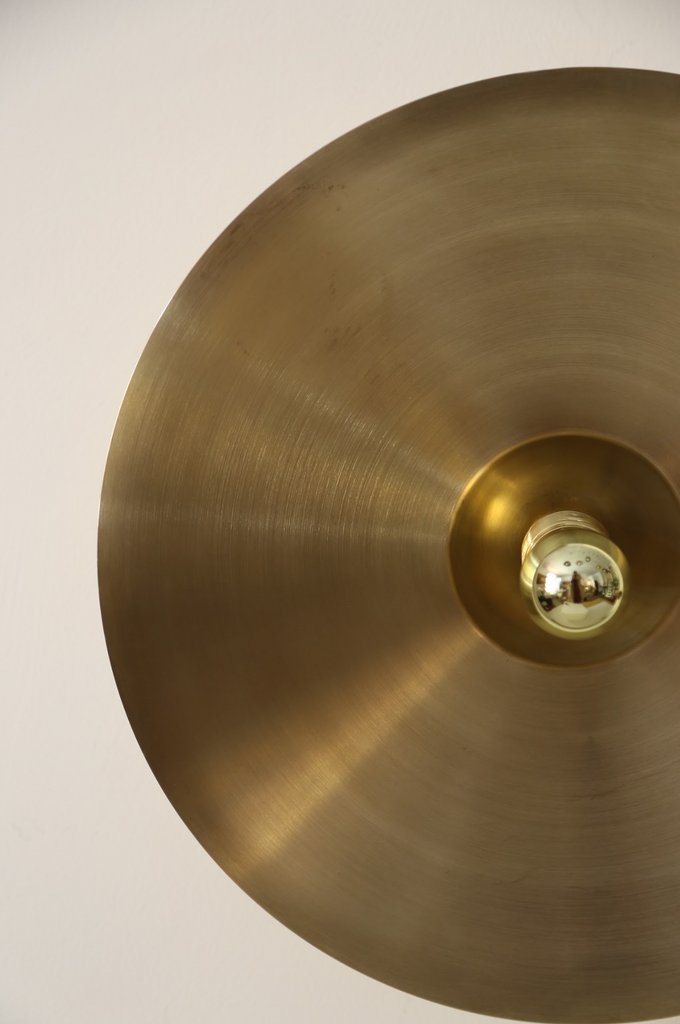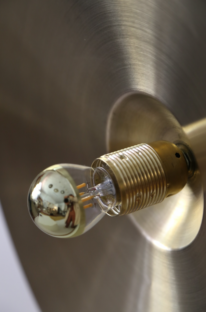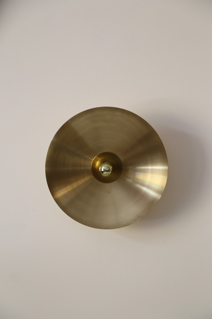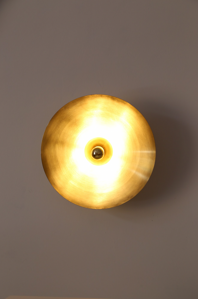 Aplique platillo de latón con bombilla dorada. Nos gusta por su forma de día y el halo de luz que proyecta de noche.