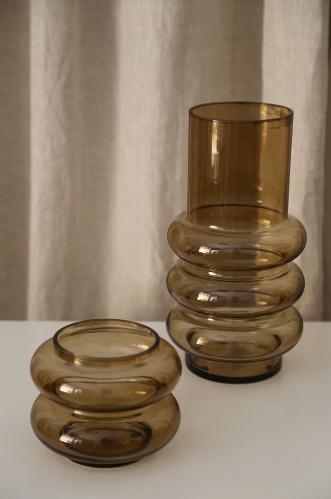 Conjunto de floreros de cristal fumé. Nos encanta por sus formas de estilo retro, por sus brillos y transparencia. Una pequeña pieza decorativa que nos encanta.