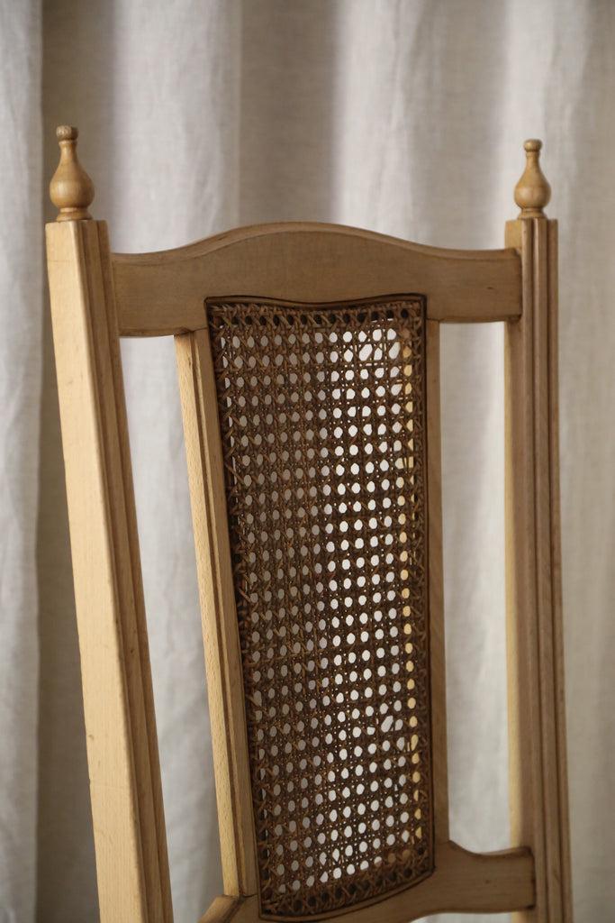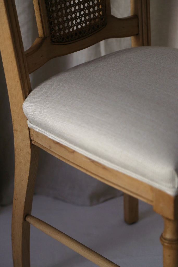 Juego de 4 sillas recuperadas de estilo Inglés en madera de haya, con asiento tapizado con tejido de algodón y lana de la firma francesa James Malone y respaldo de rejilla.