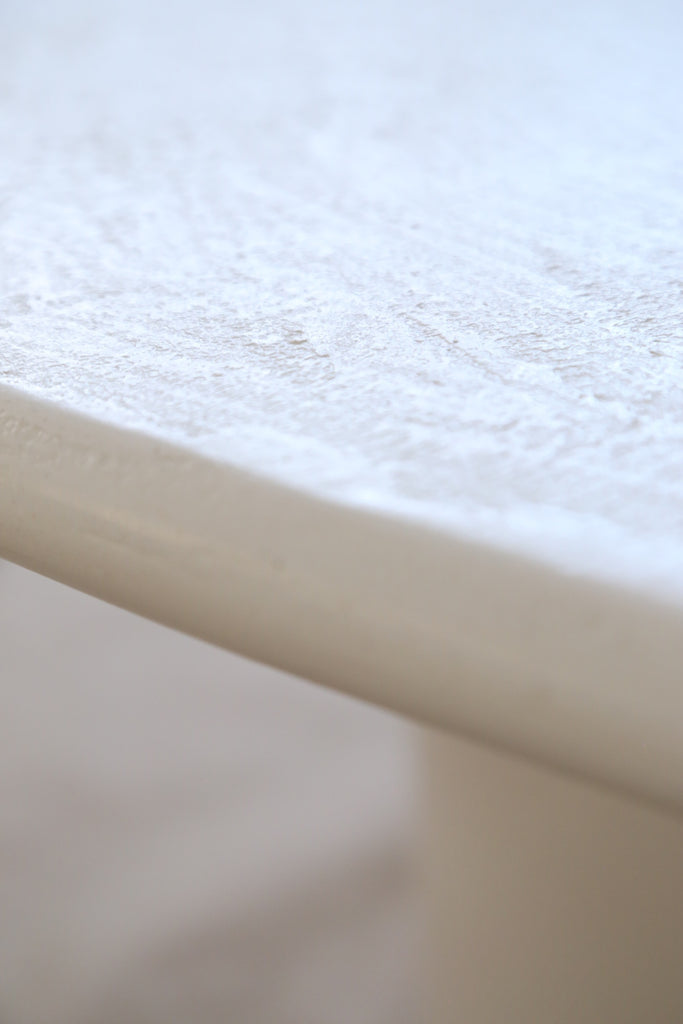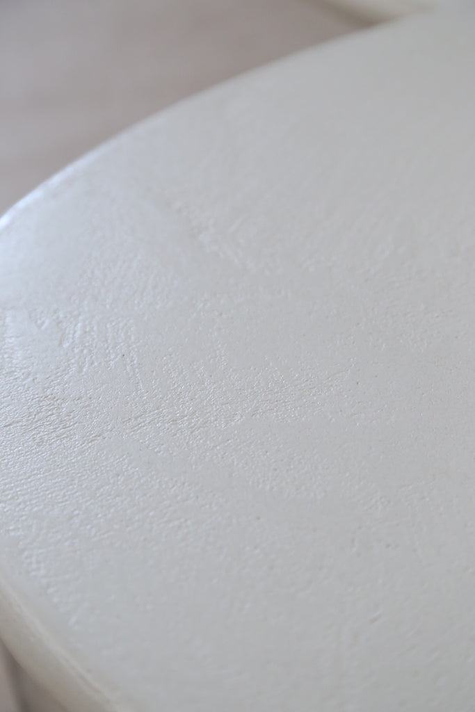 Las mesas Arándiga son fabricadas de forma artesanal en microcemento medio lo que hace que cada pieza sea ligeramente diferente y única. Les aplicamos un barniz mate para hacerlas resistentes a líquidos y manchas sin perder el aspecto orgánico y la textura.