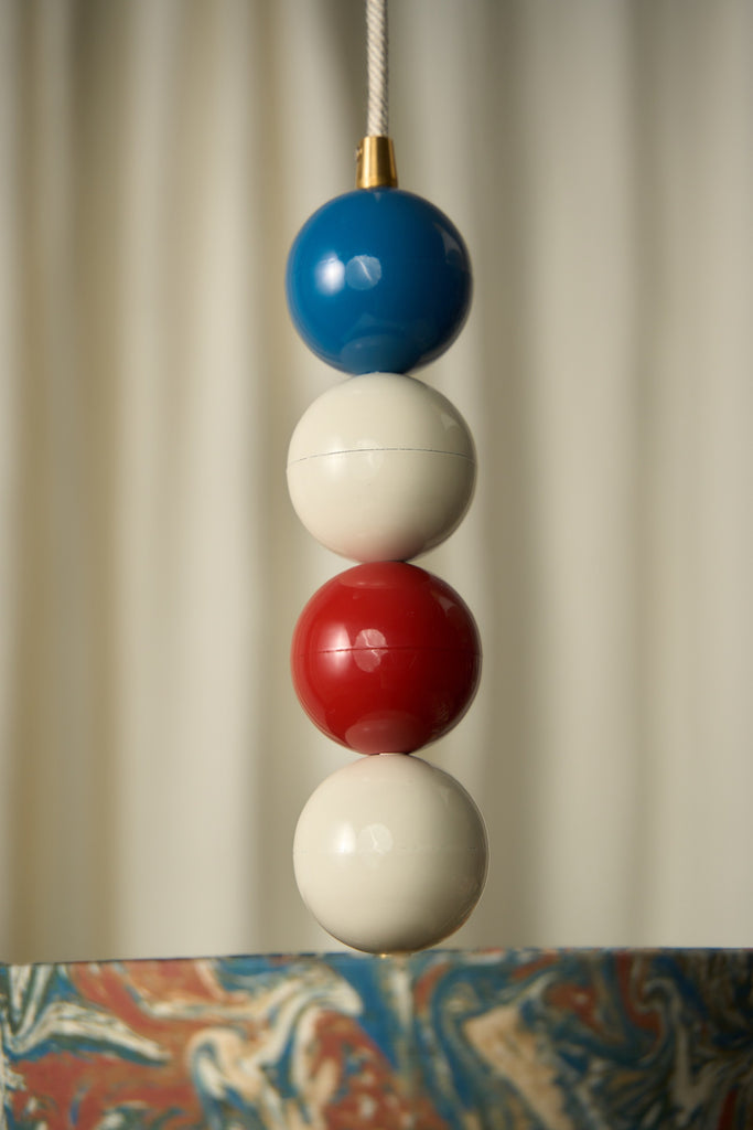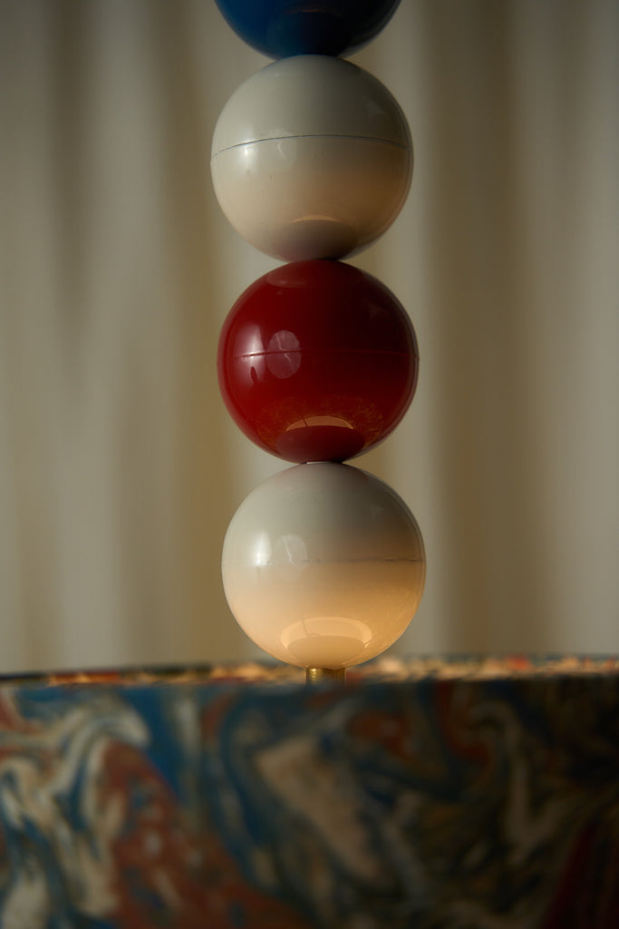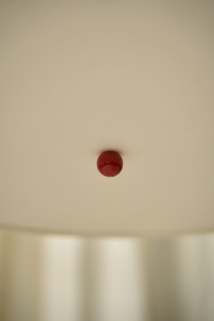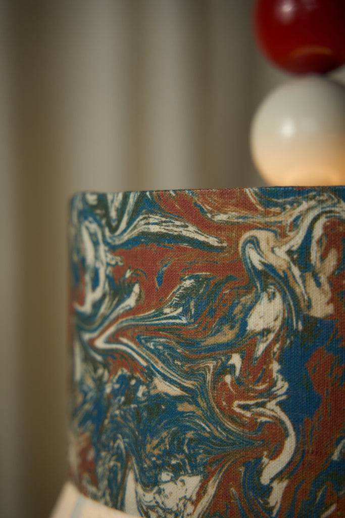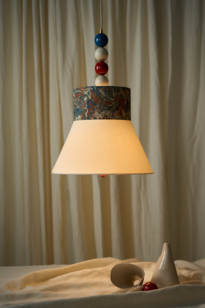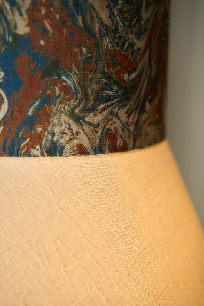 Lámpara de techo escultural. La laca brillo del metal contrasta con el lino de la pantalla y combina con el diseño marmoleado de la pieza central. La luz se difumina a través de la tela consiguiendo una iluminación única.