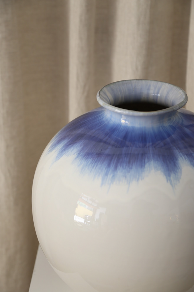 Tinaja cerámica esmaltada hecha artesanalmente. Nos encanta por su color y delicadeza. La colocaríamos sobre una peana o sobre una mesa de comedor con unas ramas altas.
