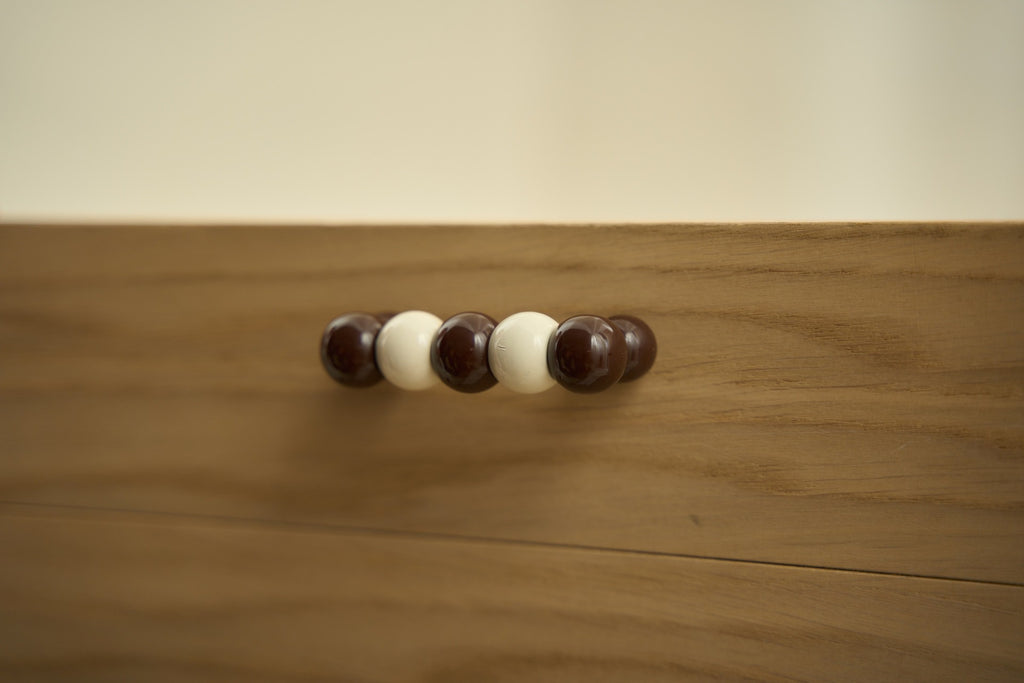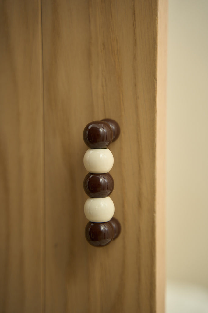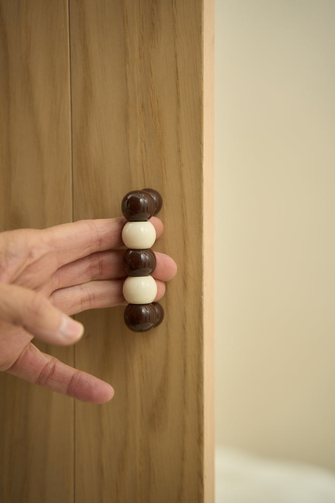 Tirador escultural. La laca brillo de las piezas que lo componen nos recuerdan al brillo del chocolate y el caramelo.